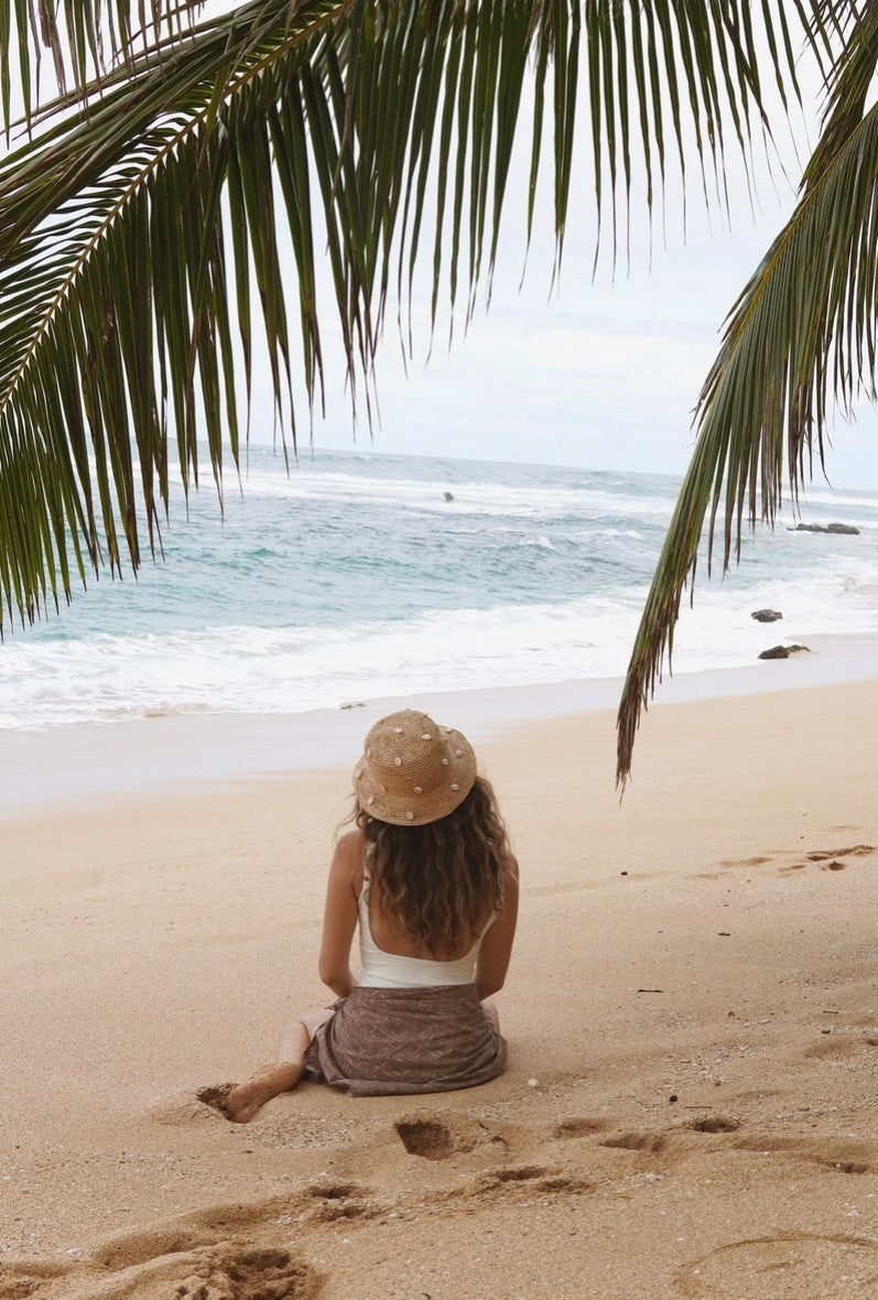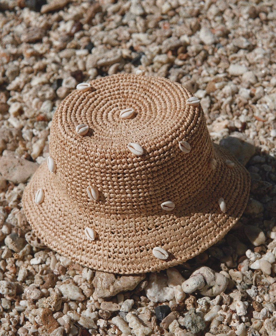 Your new hat for sea shell hunting! This playful raffia bucket hat is decorated with hand-picked and hand-sewn cowy shells. It's a beachy spin on a classic style.