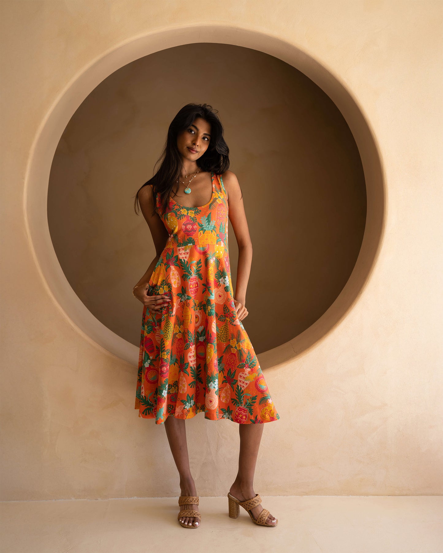 This tropical dress drapes in soft, stretchy fabric that flows like a sea breeze. Designed with a flattering scoop neckline, secret side pockets, and a vibrant print inspired by lush island gardens, it’s the dress you’ll reach for from golden hour strolls to seaside dinners. Slip it on, and let the day unfold like a postcard.