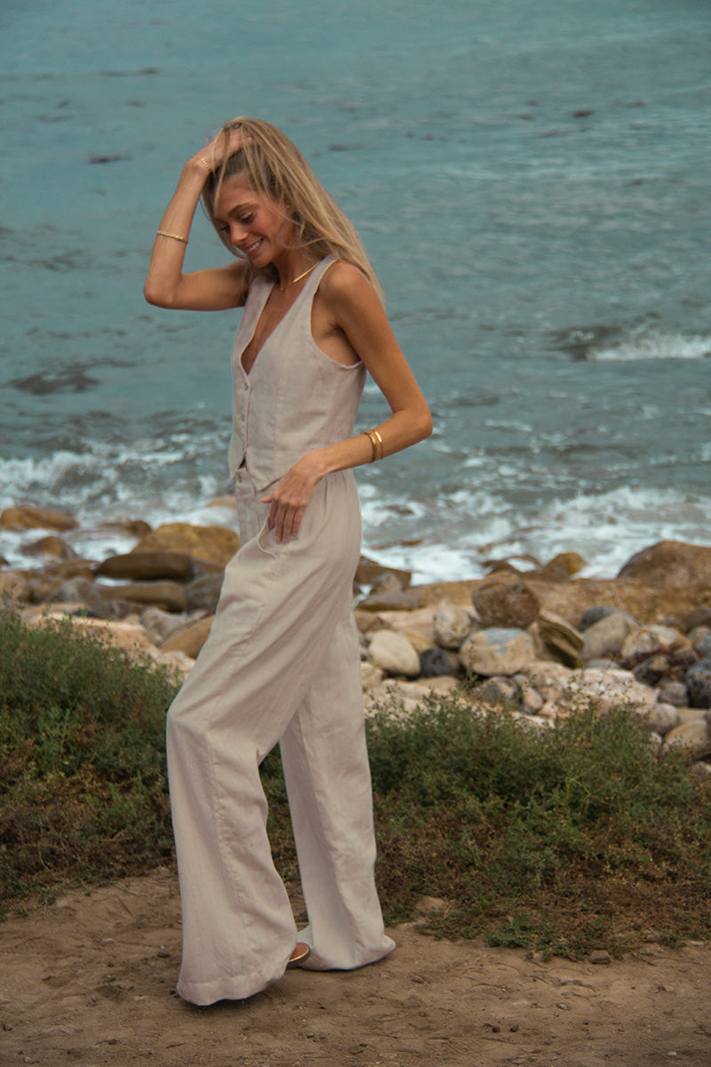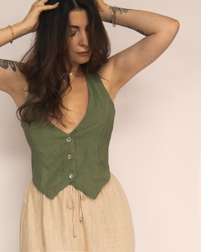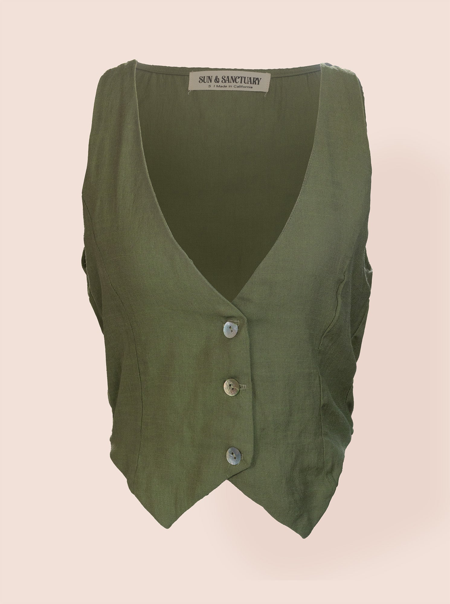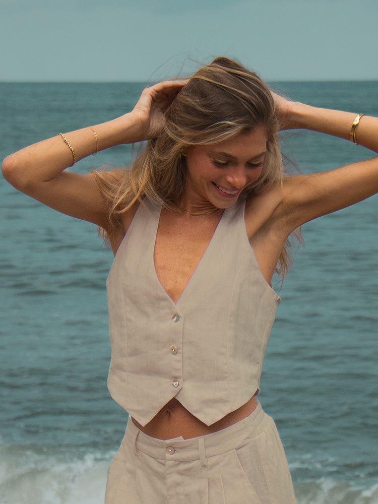 This breezy, beachy vest is easy to style and adds sophistication to any outfit. Featuring a lined front and expertly tailored princess seams, it offers a flattering silhouette that complements any look. Natural shell buttons add a touch of shine. Perfect for coastal getaways or everyday chic.