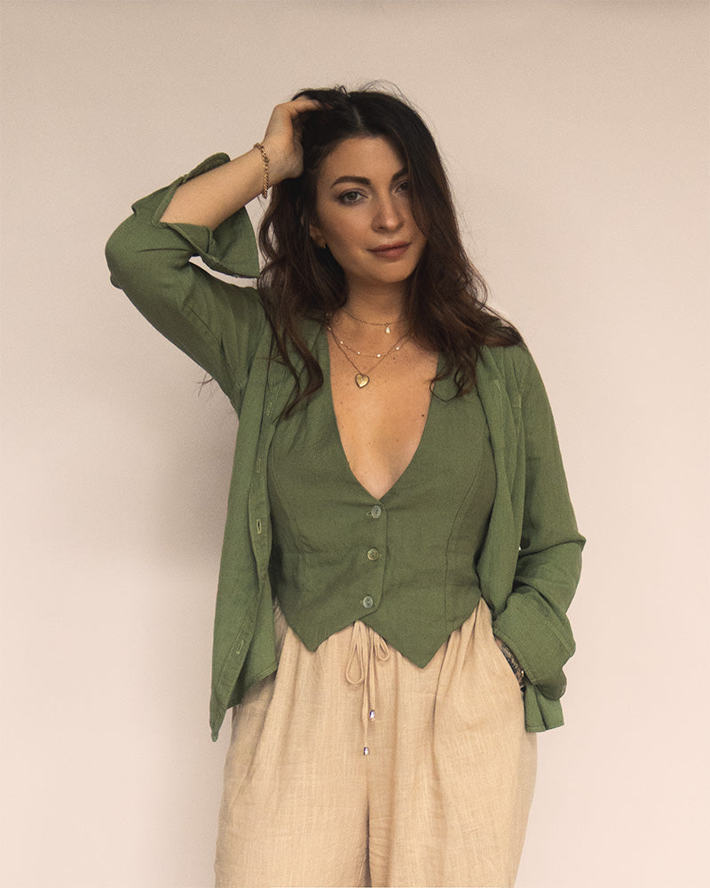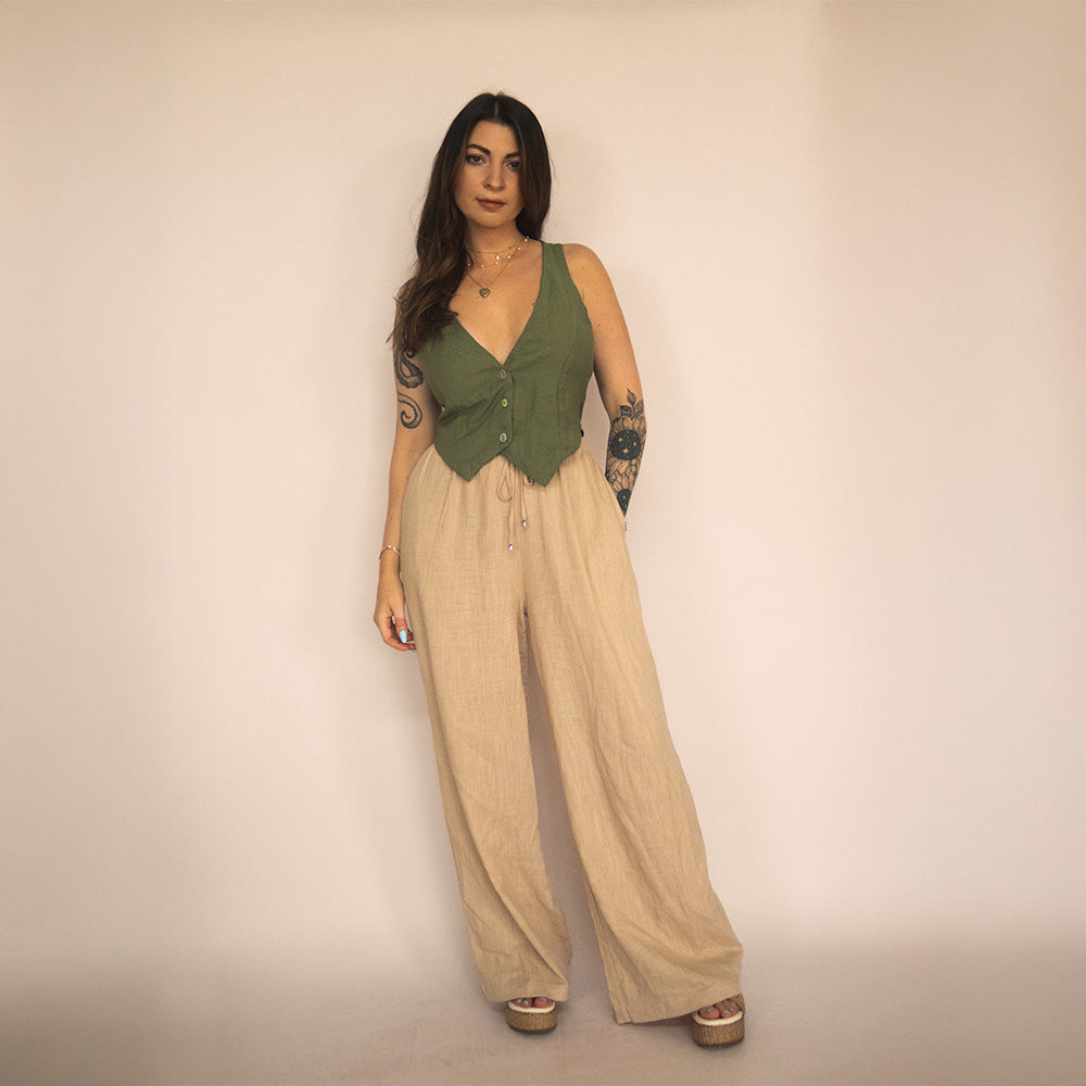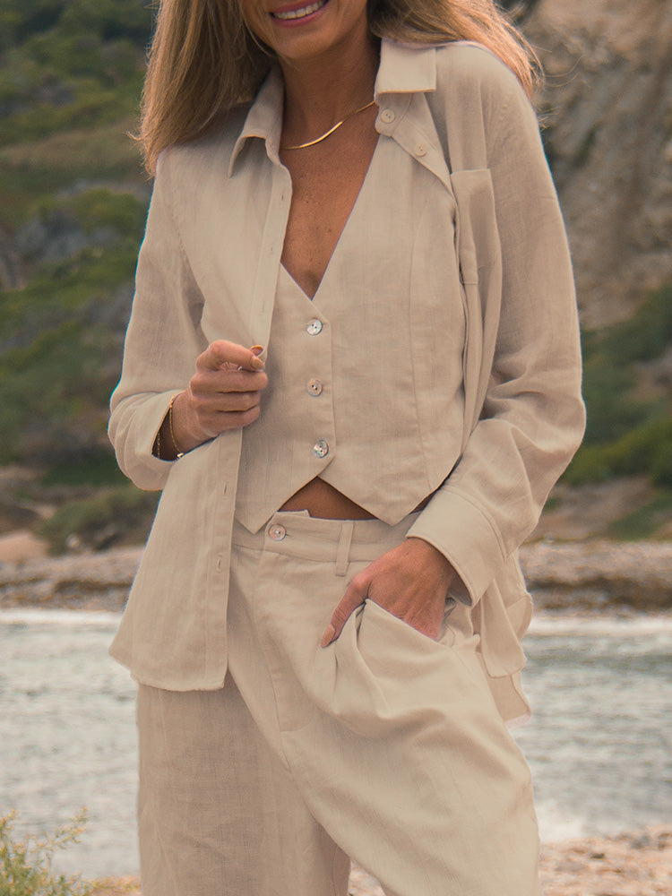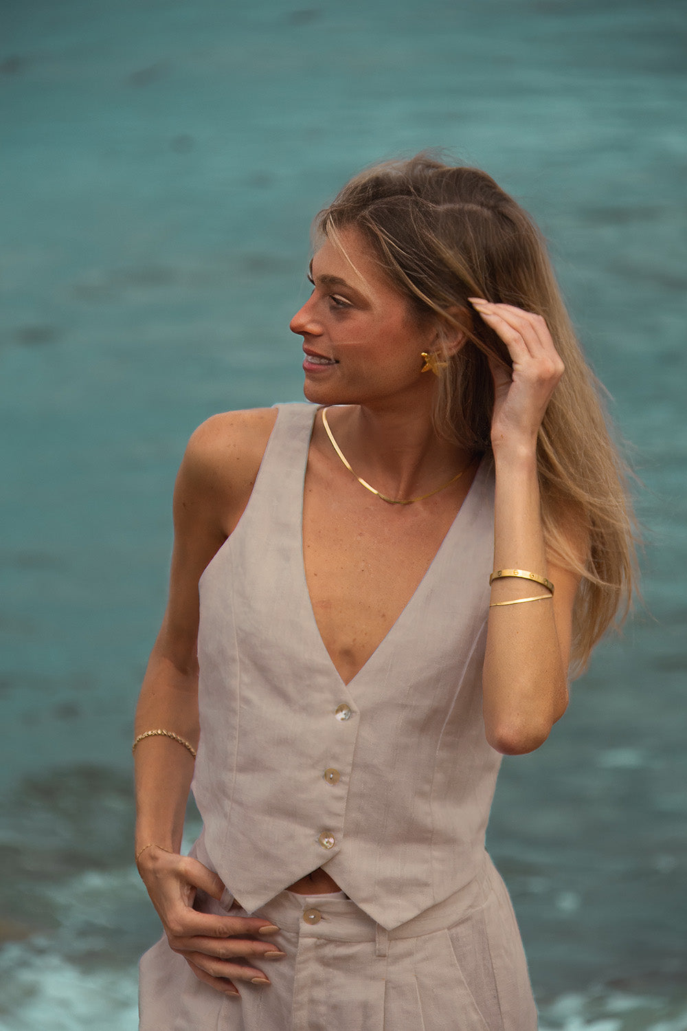 This breezy, beachy vest is easy to style and adds sophistication to any outfit. Featuring a lined front and expertly tailored princess seams, it offers a flattering silhouette that complements any look. Natural shell buttons add a touch of shine. Perfect for coastal getaways or everyday chic.